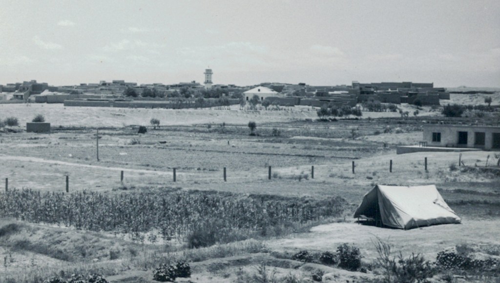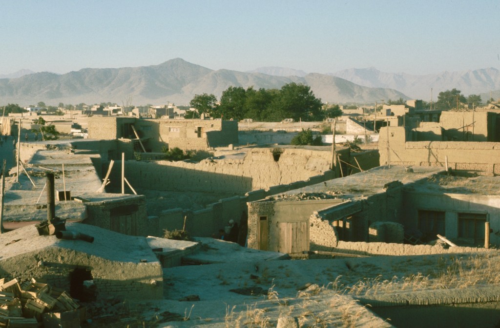 The view looking down the same street in the opposite direction shows the naan (flatbread) bakery, or “tandoor” oven in the foreground. Every neighborhood had one of these. The naan was delicious fresh, and cost us seven cents a loaf, which was about double what the Afghans paid.
