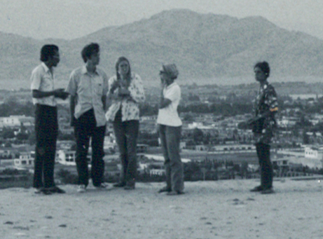 Shamshere, Sandy, and ? trying to beat the heat, standing under stream of water from roof storage tank. There was no air conditioning!