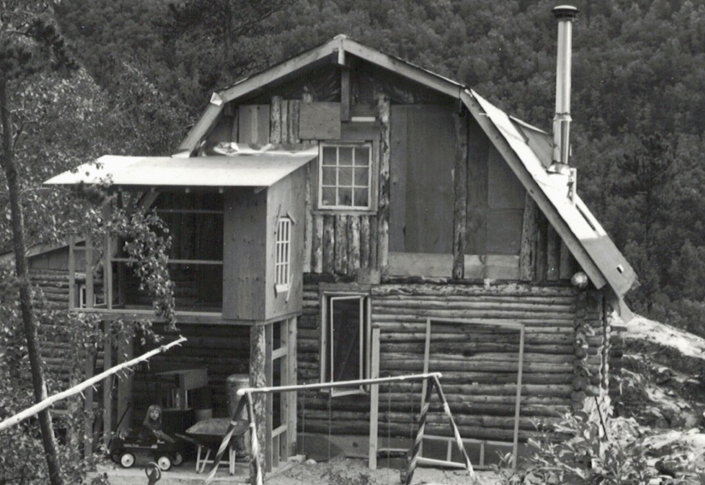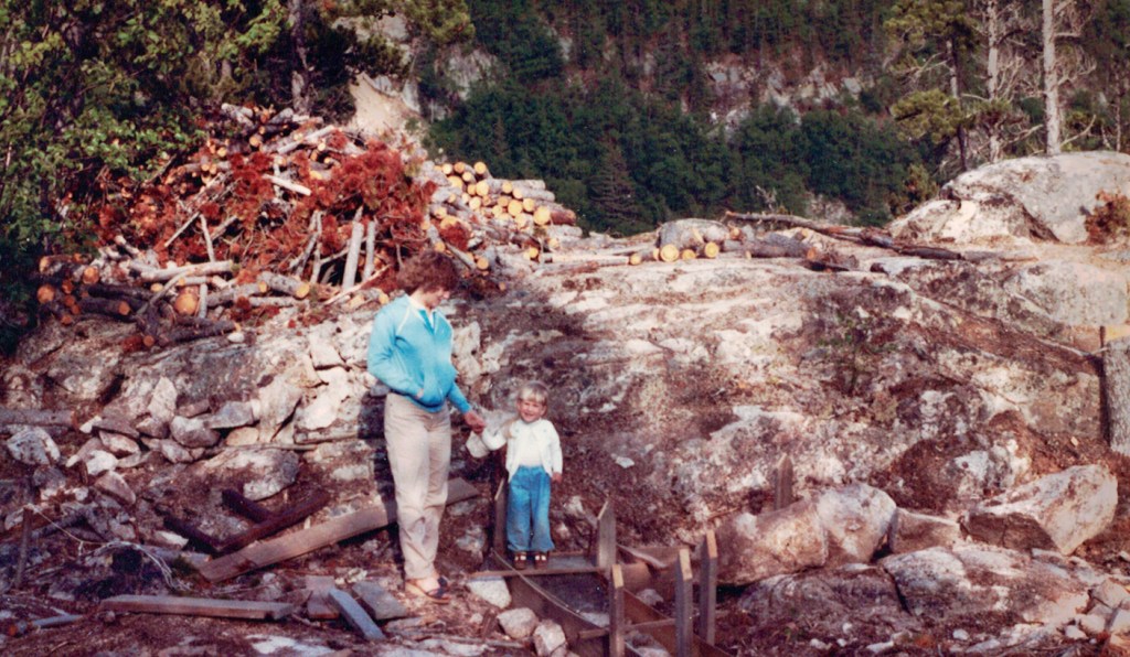 Celebration! The day before I had poured the first wheelbarrows of concrete into the footing forms. My daughter stands on the partially cured concrete, with my wife holding her hand. Behind them you can see I’ve already started piling up firewood rounds we would eventually use to heat our home. We needed at least five cords of wood to make it through the cold winters. At this early stage the chain saw was working, though I spent as much or more time working on it as falling and limbing trees!