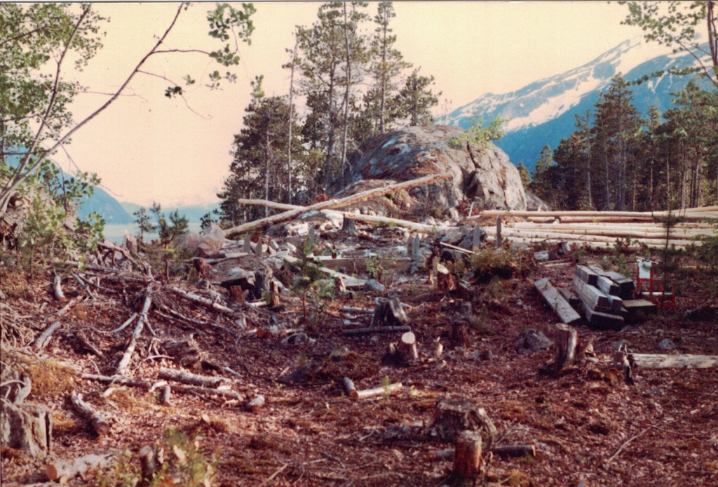 In this photo the site is mostly cleared. Quite a few logs are stacked in the background. These are lodgepole pines, which only reach the shore of Southeast Alaska at a couple of places, Skagway and a few miles south.