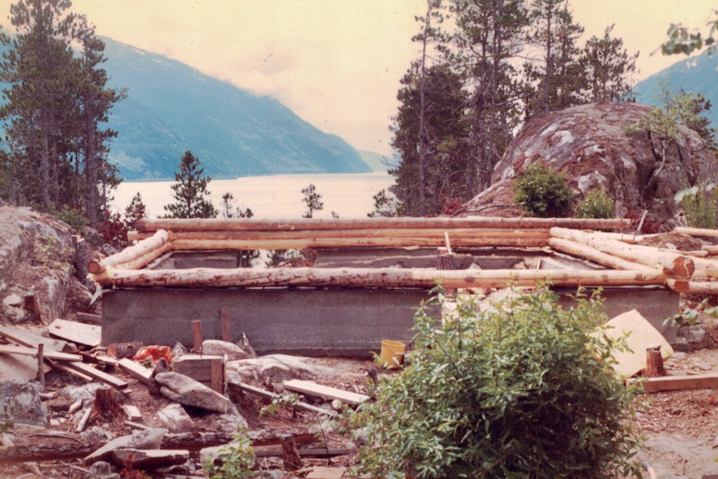 The foundation and first rows of logs. The view down the fjord was spectacular. I mixed the concrete for a footing and 2 foot high stem wall, a grueling and repetitious task that added several pounds of muscle to my previously slender frame. Dragging logs up to the foundation was equally arduous.