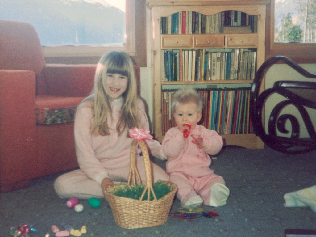 In 1989 our second daughter, Haley arrived. I had also added a 12X16 foot two story addition to the house. I had had my fill of chainsaw and log work, and had gained much building experience. The addition extended out over the draw, facing south, with decks on both levels. Here Lesley and Haley sit in the new living room, celebrating Haley’s first Easter, 1990. I’d also built a shop and taught myself cabinet making, which resulted in extra income in the winter. The book case made of pine board s was one of my first efforts.