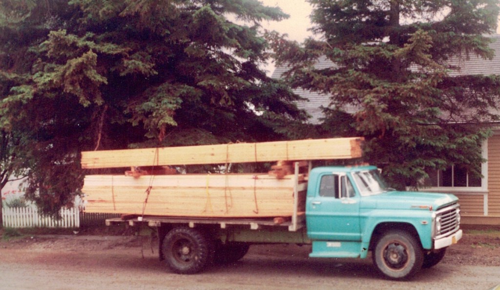 When we had accumulated a few dollars from my wife’s job and my occasional part-time work we ordered lumber for the floor joists, floor decking, and roof decking. The cheapest option was local spruce lumber milled by a man in nearby town of Haines. Buster Benson was missing most of the fingers of his hands from many years of operating his mill, but it didn’t seem to slow him down. The unplaned 2X12 joists were almost completely knot free, and measured a full 2 inches by 12 inches — not the 1 1/2X11 1/2 inches of commercial lumber. The decking was 1 inch thick. Here the loaded truck has come off the ferry from Haines (The only option from Haines to Skagway unless you drive 350 miles through Canada!) and is ready to head up Dyea road to our house site.