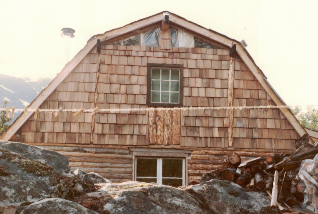 Before winter set in I managed to finish the gable ends with cedar shakes, and install some temporary salvaged windows. The next summer (1984) I replaced the plastic in the top triangular openings with glass, and installed new windows in the rest of the house; thanks partly to a grant program Alaska implemented, which helped Alaskans update windows and doors, and better weatherize their homes.
