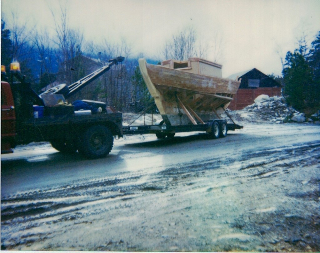 With two children, and my wife now working full-time at the post office we regretfully decided to rent the house and move into Skagway. It was getting hard to keep up with work, school activities and the house chores. Electricity and phone service still had not been extended as far as our place (That happened a few years later.), and we still relied on creek water. Even so, I was able to realize my dream of building an ocean capable sailboat, which I launched in Haines in 1998. In the above photo the boat is being towed out of the shop and onto a low trailer for transport to town. It was quite an operation! You can see more photos of my boat project here on my website: https://mikerostron.com/once-i-built-a-boat/